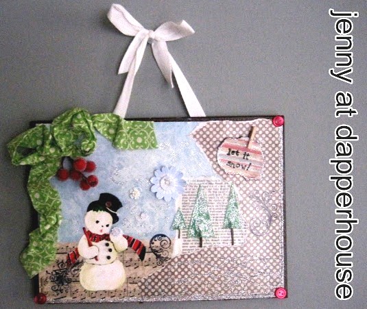 Those of you who know me are aware of my affinity for Altered Art. I love looking at it and creating it. I did a lot for Halloween that sold in the Urban Chic Home Boutique and did some again for Winter as a gift for a family member. Here is a Do It Yourself Tutorial on how I did my Wall Hanging so that you can take the same make something beautiful of your own. You will need decorative papers, glitter glue, Modge Podge, paint, paint brushes of various sizes, stamps and ink, scissors, buttons, beads, bows, fake berries, twigs and any other embellishments you want to use. I also used a snowman printed from the computer an a royalty free site like Graphics Fairy. Put something together in whatever way you think looks good by using all sorts of craft supplies 🙂 Here is the one I made. . .