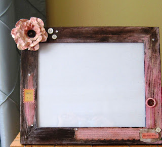 8.)    I Modge Podged this to the bottom right corner and began to play around with the positions of my adornments . During the process I remembered that I had pink embroidery circles with mirrored plastic inside. I removed the mirrored pieces and fit vintage brown buttons inside. I added the rest of my embellishments with strong craft glue.