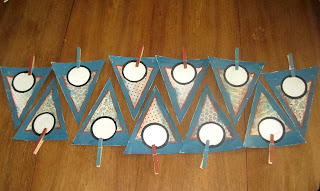 11 large, heavy banners hand painted, decorative paper and hand painted paper circles for customization with name or words 7 inches across top and 9 inches long painted black back