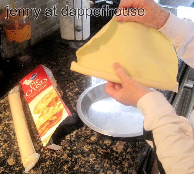 Start with spreading a pie crust into a pie pan. The dough will crack and not be easy to work with if you use it right from the fridge, so let it stand at room temperature for a bit first.