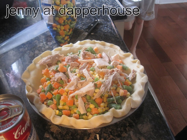 Add leftover turkey filling the bottom of the pie.